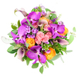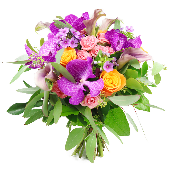 Putting a bright start in somebody’s day starts with a beautiful gift. Our delightfully vibrant bouquet is filled with a medley of blooms in cheerful pops of orange, pink and purple, with plenty of lush greenery mixed in.