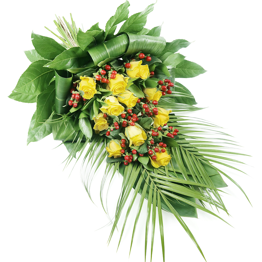 - Vibrant Colors: A harmonious blend of yellow roses and red hypericum creates a stunning display of warmth and love.