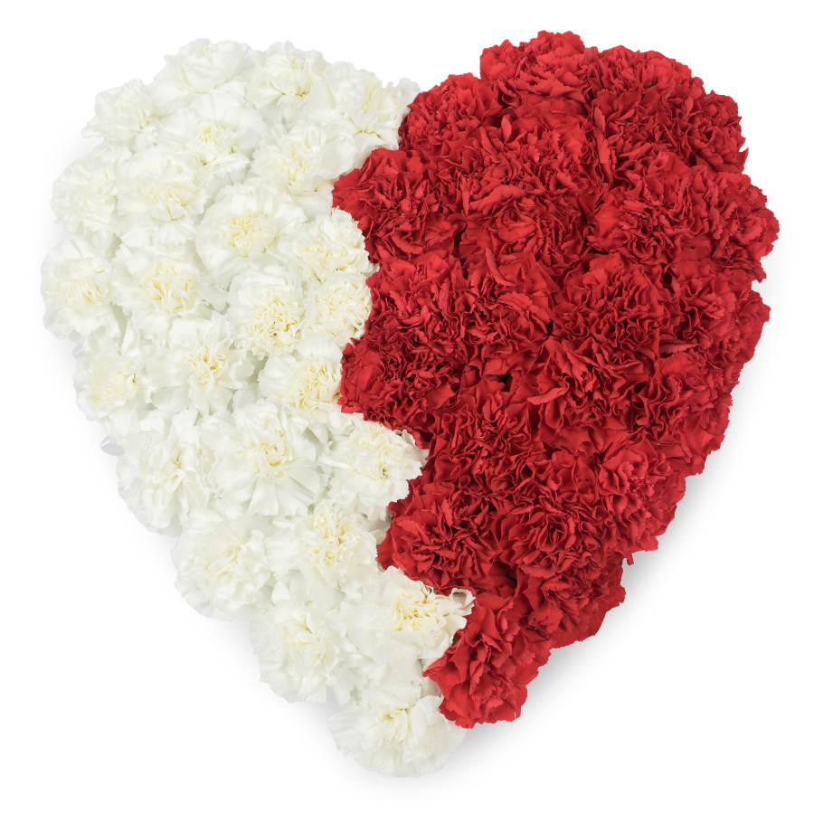 Presenting the Heart of Love Carnation Arrangement, a beautiful creation by Handy Flowers. This bouquet showcases a stunning combination of white and red carnations, elegantly arranged in a heart shape to convey love and sympathy.